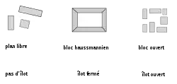 - le bloc haussmannien qui offre une façade continue sur la rue et, à l'intérieur, se referme sur une cour intérieure ;