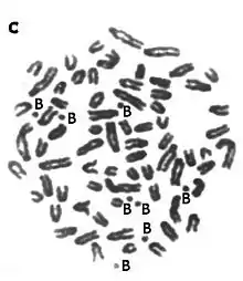 En plus du caryotype normal, les populations sauvages de plusieurs animaux, plantes, champignons et espèces contiennent des chromosomes B (également connus sous le nom surnuméraires, accessoires, dispensables, ou des chromosomes spécifiques de la lignée). Par définition, ces chromosomes ne sont pas essentiels à la vie d'une espèce et font défaut à certains (généralement la plupart) des individus. Ainsi, une population serait composée d'individus avec 0, 1, 2, 3 (etc. ) chromosomes B. [1] Les chromosomes B sont distincts des chromosomes marqueurs ou des copies supplémentaires des chromosomes normaux tels qu'ils se produisent dans les trisomies.