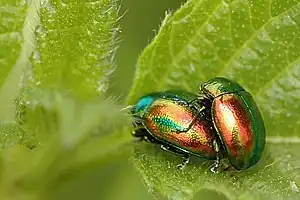 Couple de Chrysolina fastuosa, photographié dans les Ardennes belges