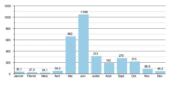 Le débit moyen mensuel observé en février (minimum d'étiage) est de 24,1 m3/s, soit moins de 2,5 % du débit moyen du mois de juin (1 046 m3/s), ce qui souligne l'amplitude fort élevée des variations saisonnières. Les écarts de débit mensuel peuvent être encore plus marqués d'après les années : sur la durée d'observation de 53 ans, le débit mensuel minimal a été de 9,37 m3/s en , tandis que le débit mensuel maximal s'élevait à 1 860 m3/s en , soit plus que le débit du Rhône à Arles, en fin de parcours.