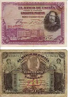 L'un des points clés de la propagande de la dictature fut qu'elle avait réussi à rétablir la valeur de la peseta — la « dépréciation de la monnaie » avait été l'une des raisons invoquées pour justifier le coup d'État. Lorsque Primo de Rivera arriva au pouvoir, le taux de change du dollar américain était de 7,50 pesetas ; dans les années suivantes, la monnaie espagnole se réévalua par rapport au dollar et à la livre sterling. En 1927, le taux de change du dollar était de 5,18 pesetas et celui de la livre sterling était légèrement inférieur à 28 pesetas[86]. Néanmoins, la réévaluation de la peseta était en grande partie artificielle, puisqu'elle était fondamentalement due à des mouvements spéculatifs de capitaux étrangers attirés par des taux d'intérêt élevés et les perspectives haussières de la monnaie — qui répondaient à la réduction du déficit de la balance commerciale et, surtout, à la consolidation du régime dictatorial, avec la victoire dans la guerre du Rif et le passage du Directoire militaire au Directoire civil en décembre 1925[87] —.