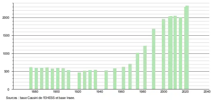 L'évolution du nombre d'habitants est connue à travers les recensements de la population effectués dans la commune depuis 1876. Pour les communes de moins de 10 000 habitants, une enquête de recensement portant sur toute la population est réalisée tous les cinq ans, les populations légales des années intermédiaires étant quant à elles estimées par interpolation ou extrapolation[19]. Pour la commune, le premier recensement exhaustif entrant dans le cadre du nouveau dispositif a été réalisé en 2005[20].