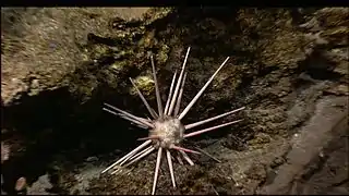 - Les radioles primaires sont très longues, épaisses et robustes, parfois complexes[2] (comme chez les Goniocidaris[3], mais jamais en forme de massue aussi marquée que chez certains autres Cidaroida) ; elles sont souvent couvertes d'épibiontes (algues, éponges...), car le squelette (stéréome) y est à nu, dépourvu d'épiderme[4]. Peu nombreuses, elles laissent apparaître le test souvent protégé par des radioles secondaires plus petites, généralement très courtes et aplaties.