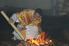 La Vigile pascale commence par un rituel du feu, symbole du Christ ressuscité qui est la lumière du monde. Le prêtre bénit le feu et plante sur la croix cinq grains d'encens symbolisant les cinq plaies du Christ (aux mains, aux pieds et au côté.). Puis le cierge pascal est allumé au feu et est porté par le diacre suivi de l'assemblée dans l'église encore plongée dans l'obscurité. Lors de cette procession, le diacre marque trois arrêts, se retourne vers l'assemblée et proclame ou chante « lumière du Christ », ce à quoi l'assemblée réponds « nous rendons grâce à Dieu », en allumant progressivement ses propres cierges, signifiant la publication progressive de la Bonne Nouvelle de la Résurrection dans le monde. Le diacre dépose ensuite le cierge sur son support, et après avoir demandé la bénédiction du célébrant, entonne face au cierge le chant de l'Exultet[4].