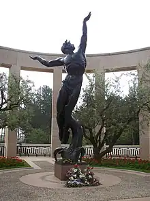 Si les allées de services permettent d'accéder au cimetière en de multiples endroits, les accès principaux guident généralement le visiteur à entrer par la face est et son mémorial de style néo-classique d'où se dresse une statue en bronze de sept mètres de haut, œuvre de Donald De Lue, qui occupe le centre d'une colonnade semi-circulaire honorant les troupes aéroportées et leur rôle de bouclier qu'elles ont assuré aux deux extrémités[12] du front du débarquement amphibie lors de l'opération Neptune [13]. Orientée vers l'ouest, son regard embrasse les nombreux alignements de sépultures. Elle symbolise « L'esprit de la jeunesse américaine s'élevant des flots ».