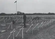 Dix blocs, séparés par l'allée centrale en deux groupes de cinq, forment l'espace dédié aux tombes où reposent les corps de 9 387 personnes[15], dont 307 inconnus et quatre femmes[alpha 2]. Ces personnes sont principalement mortes le jour du débarquement ou dans les semaines suivantes en Normandie, principalement au combat. 14 000 dépouilles, d'abord inhumées en Normandie, ont été rapatriées aux États-Unis, à la demande de leurs proches.