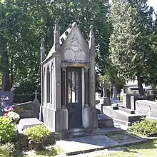 Ce monument est l’un des rares du cimetière à s’apparenter à un style néogothique. Il est réalisé en granit fin. Il adopte la forme d’une chapelle funéraire[25] dont les ouvertures sont enrichies de trois vitraux colorés. Le choix du néogothique témoigne d’une certaine appartenance au monde catholique.