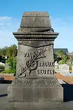 - le monument De Broux-Seutin, catafalque en pierre bleue orné d'une frise de palmettes à sa base et d'une couronne funéraire traversée d'une palme sur sa face antérieure, sommé d'un entablement à frise de gouttes portant un cercueil de pierre orné de couronnes funéraires, de rubans et de guirlandes ;