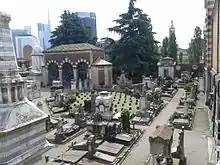 - et les tombeaux de « grandes familles » de Milan comme celles des familles Falck (aciéries), Bernocchi (fondatrice de la Triennale de Milan), Bocconi (fondatrice de l'université homonyme et des grands magasins La Rinascente).