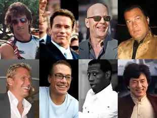 Quelques vedettes masculines des films hollywoodiens dans les années 1980-1990 (de gauche à droite et de haut en bas) : Sylvester Stallone, Arnold Schwarzenegger, Bruce Willis, Steven Segal / Dolph Lundgren, Jean-Claude Van Damme, Wesley Snipes, Jackie Chan.