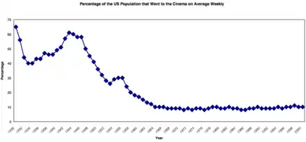 Pourcentage de la population américaine allant au cinéma en moyenne, chaque semaine, 1930-2000