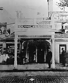 Léo-Ernest Ouimet et la première salle du Ouimetoscope en 1906. | ||