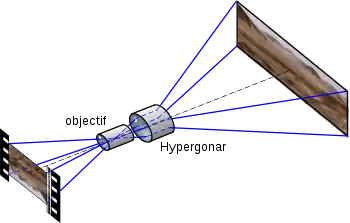 Grâce à un objectif déformant (anamorphose), l'image est comprimée dans le sens horizontal lors de la prise de vue sur film classique ; à la projection, elle est étirée dans les mêmes proportions, ce qui permet de retrouver une image panoramique.