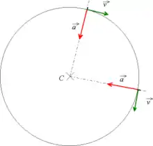 On voit aussi que l'accélération est toujours dirigée vers le centre du cercle (on parle d’accélération centrale centripète), et sa norme vaut
