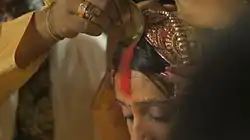 Des poudres rouges contenant du cinabre sont souvent utilisées en Inde pour faire des marques corporelles. Ainsi, le sindoor est une marque faite d’une poudre rouge, portée par les femmes mariées, dans la partie supérieure du front jusque dans la raie centrale les cheveux. Selon la tradition, les femmes doivent se parer du sindoor tant que leur mari est vivant[54]. D’ailleurs les déesses Parvati (épouse de Shiva) et Sītā (épouse de Rāma), le portent aussi. Le sindoor est fait d’un mélange de curcuma, de chaux et de poudre de cinabre (avec parfois du minium), auquel on prêtre beaucoup de vertus, dont le pouvoir de stimuler la sexualité et la fertilité.