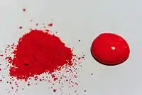 Le cinabre est un pigment de teinte rouge vermillon obtenu par broyage et lévigation (lavage) de l’espèce minérale de sulfure de mercure(II)[n 1].