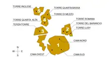 - Torre Seconda, composée de trois cimes distinctes appelées Torre Lusy, Torre del Barancio et Torre Romana ;