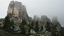 Vue des Cinque Torri depuis le col de Falzarego ; de droite à gauche : Torre Grande, Torre del Barancio, Torre Latina, Torre Quarta et Torre Quinta. | |