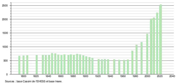 L'évolution du nombre d'habitants est connue à travers les recensements de la population effectués dans la commune depuis 1793. Pour les communes de moins de 10 000 habitants, une enquête de recensement portant sur toute la population est réalisée tous les cinq ans, les populations légales des années intermédiaires étant quant à elles estimées par interpolation ou extrapolation[24]. Pour la commune, le premier recensement exhaustif entrant dans le cadre du nouveau dispositif a été réalisé en 2005[25].