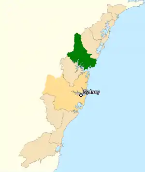 La circonscription de Robertson (en vert) au nord de Sydney en Nouvelle-Galles du Sud.