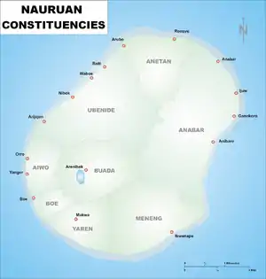 Ces huit circonscriptions électorales sont composées des quatorze districts de Nauru. Ce découpage électoral est inscrit dans l'article 28 de la constitution du pays qui date de 1968, année de l'indépendance[1].
