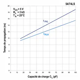 Les valeurs suivantes sont données à titre indicatif, car elles sont susceptibles de varier légèrement d'un constructeur à l'autre. Néanmoins, elles sont représentatives des valeurs constatées chez les différents constructeurs pour les circuits TTL de référence générique 74x00 (ou 54x00 pour les séries militaires) appartenant à une même série.