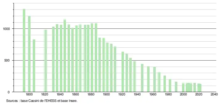 L'évolution du nombre d'habitants est connue à travers les recensements de la population effectués dans la commune depuis 1793. Pour les communes de moins de 10 000 habitants, une enquête de recensement portant sur toute la population est réalisée tous les cinq ans, les populations légales des années intermédiaires étant quant à elles estimées par interpolation ou extrapolation[17]. Pour la commune, le premier recensement exhaustif entrant dans le cadre du nouveau dispositif a été réalisé en 2004[18].