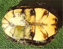 C'est une tortue de petite taille, en moyenne 14 cm, au maximum 20 cm, avec une carapace légèrement bombée, rappelant la forme d'un galet. Cette carapace est lisse, brun foncé-noirâtre avec des rayures et des taches jaunes. Le plastron est brun avec un dessus jaunâtre. La peau est constellée de points jaunes. La queue est assez longue, même pour les femelles, et plus encore chez les jeunes.