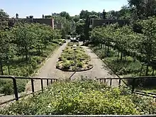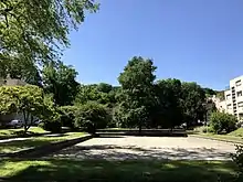 La topographie du site ainsi que les éléments paysagers préexistants, ont été préservés par le paysagiste André Riousse[10], attentif à l’histoire locale, qui a choisi d’exploiter les perspectives existantes et conserver les arbres de l’ancien parc du château qui existait autrefois[3].