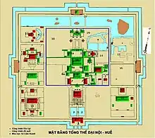 Cette partie de la Cité impériale recouvre une surface de 10 hectares. Son périmètre est de 1 229,36 m. La Cité est entourée de murs de 3,72 m de hauteur et de 0,72 m d'épaisseur et sont percés de sept ouvertures. Ses bâtiments et ses nombreuses cours ont été construits à partir de 1802 sous le règne de l'empereur Gia Long, jusqu'en 1833 sous le règne de son fils, l'empereur Minh Mang. La principale porte d'entrée, Dai Cung, a été construite en 1833.