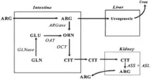 - La deuxième de ces voies implique l’intestin et les reins : l’intestin est le principal producteur de L-citrulline (via l’OCT ≈ 10 g/j chez l’adulte sain)[5], qui est alors libérée dans la circulation périphérique et à nouveau convertie en arginine dans les reins (par l’ASS)[6] ce qui permet d’assurer la synthèse endogène d’arginine. En effet, l’arginine absorbée par l’intestin est quasi totalement dégradée au niveau hépatique par l’importante activité de l’arginase présente dans le foie[7],[8]. De plus, l’arginine exerce un rétrocontrôle positif sur l’uréogenèse (à travers une stimulation de la N-acétylglutamate synthase[9]), ce qui pourrait entraîner une dégradation excessive de l’arginine et de tous les acides aminés lors d’apports importants en arginine. La L-citrulline n’étant pas captée par le foie[5], elle constituerait un excellent moyen physiologique de préserver l’arginine pour son utilisation au niveau périphérique.