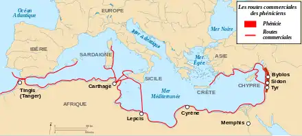 L'Afrique du Nord qui, au départ, n'est vraisemblablement pour les Phéniciens qu'une simple étape sur la route des métaux d'Espagne, connaît des installations phéniciennes permanentes de façon très précoce, comme Utique qui est fondée en selon Pline l'Ancien[6]. Le XIIe siècle av. J.-C. aurait vu également une installation à Lixus au Maroc[7] et la fondation de Gadès en Espagne[8].