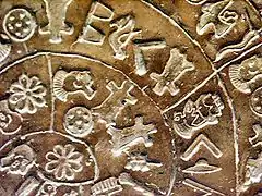 L'exemplaire le plus important d'inscription hiéroglyphique crétoise est le disque de Phaistos, découvert en 1903 dans un dépôt dans les appartements nord-est du palais. Une tablette en linéaire A et de la céramique du début de la période néopalatiale furent découverts en compagnie du disque. Les deux surfaces du disque sont couvertes de hiéroglyphes disposés en spirale, et imprimés dans l'argile pendant qu'elle était encore humide. Les signes forment des groupes, séparés par des lignes verticales, chacun de ces groupes devant représenter un mot. On peut y distinguer quarante-cinq types différents de signes, dont quelques-uns peuvent être identifiés aux hiéroglyphes de la période proto palatiale[55]. Certaines séries de hiéroglyphes reviennent comme des refrains, suggérant un hymne religieux.