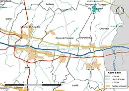 Le Cher, d'une longueur totale de 365,5 km, prend sa source à 714 mètres d'altitude à Mérinchal, dans la Creuse et se jette dans la Loire à Villandry, à 40 m d'altitude, après avoir traversé 117 communes[3]. Le Cher présente des fluctuations saisonnières de débit assez marquées. Sur le plan de la prévision des crues, la commune est située dans le tronçon du Cher tourangeau[4], dont la station hydrométrique de référence la plus proche est située à Tours [Pont Saint Sauveur]. Le débit mensuel moyen (calculé sur 53 ans pour cette station) varie de 25,8 m3/s au mois d'août à 192 m3/s au mois de février. Le débit instantané maximal observé sur cette station est de 1 000 m3/s le , la hauteur maximale relevée a été de 4,96 m le [5],[6]. Ce cours d'eau est classé dans les listes 1[Note 1] et 2[Note 2] au titre de l'article L. 214-17 du code de l'environnement sur le Bassin Loire-Bretagne. Au titre de la liste 1, aucune autorisation ou concession ne peut être accordée pour la construction de nouveaux ouvrages s'ils constituent un obstacle à la continuité écologique et le renouvellement de la concession ou de l'autorisation des ouvrages existants est subordonné à des prescriptions permettant de maintenir le très bon état écologique des eaux. Au titre de la liste 2, tout ouvrage doit être géré, entretenu et équipé selon des règles définies par l'autorité administrative, en concertation avec le propriétaire ou, à défaut, l'exploitant[7],[8]. Sur le plan piscicole, le Cher est classé en deuxième catégorie piscicole. Le groupe biologique dominant est constitué essentiellement de poissons blancs (cyprinidés) et de carnassiers (brochet, sandre et perche)[9].
