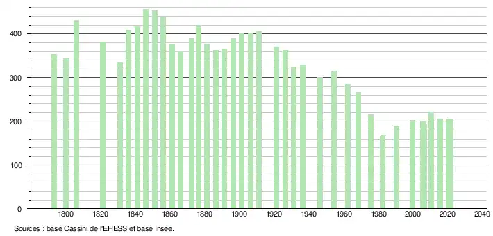 L'évolution du nombre d'habitants est connue à travers les recensements de la population effectués dans la commune depuis 1793. Pour les communes de moins de 10 000 habitants, une enquête de recensement portant sur toute la population est réalisée tous les cinq ans, les populations légales des années intermédiaires étant quant à elles estimées par interpolation ou extrapolation[24]. Pour la commune, le premier recensement exhaustif entrant dans le cadre du nouveau dispositif a été réalisé en 2005[25].
