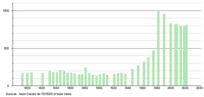 L'évolution du nombre d'habitants est connue à travers les recensements de la population effectués dans la commune depuis 1793. Pour les communes de moins de 10 000 habitants, une enquête de recensement portant sur toute la population est réalisée tous les cinq ans, les populations légales des années intermédiaires étant quant à elles estimées par interpolation ou extrapolation[17]. Pour la commune, le premier recensement exhaustif entrant dans le cadre du nouveau dispositif a été réalisé en 2008[18].