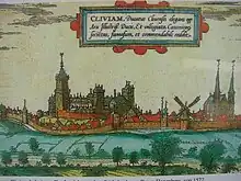 Clèves était la capitale des comtes et ducs de Clèves. Le nom de Clèves vient du bas francique Kliff, désignant une falaise abrupte, vestige d'une moraine remontant à l’Ère glaciaire, où se dressait naguère son château fort. Ce château, le Schwanenburg, construit au Xe siècle forma le noyau d'un village. Le toponyme « Cleve » est mentionné pour la première fois en 1092. Sur la colline face au château, dite Heideberg, le comte Thierry VI fonda une ville, dont les bourgeois reçurent une charte le 25 avril 1242[3]. La prérogative d'élire des échevins remonte à la fin du XIIIe siècle. L'annexion des terres de la fondation Sainte-Marie de Monterberg à Clèves, au XIVe siècle, permit à la ville de s'étendre avec la ville neuve de Hagschen. De grands incendies affectèrent la ville en 1368 puis en 1528.
