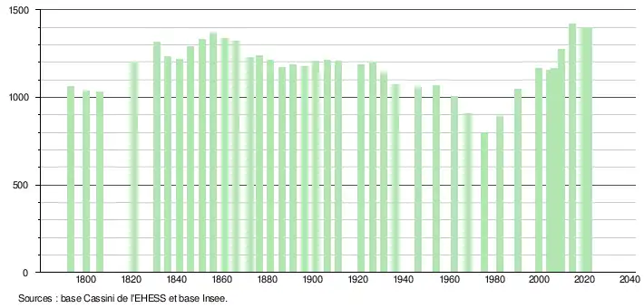 L'évolution du nombre d'habitants est connue à travers les recensements de la population effectués dans la commune depuis 1793. Pour les communes de moins de 10 000 habitants, une enquête de recensement portant sur toute la population est réalisée tous les cinq ans, les populations légales des années intermédiaires étant quant à elles estimées par interpolation ou extrapolation[26]. Pour la commune, le premier recensement exhaustif entrant dans le cadre du nouveau dispositif a été réalisé en 2004[27].