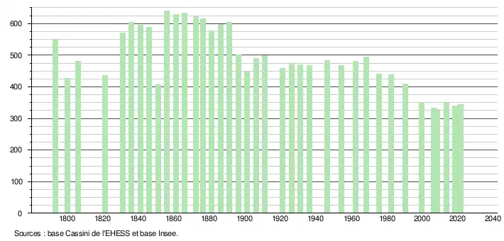 L'évolution du nombre d'habitants est connue à travers les recensements de la population effectués dans la commune depuis 1793. Pour les communes de moins de 10 000 habitants, une enquête de recensement portant sur toute la population est réalisée tous les cinq ans, les populations légales des années intermédiaires étant quant à elles estimées par interpolation ou extrapolation[39]. Pour la commune, le premier recensement exhaustif entrant dans le cadre du nouveau dispositif a été réalisé en 2008[40].