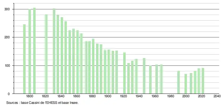 L'évolution du nombre d'habitants est connue à travers les recensements de la population effectués dans la commune depuis 1793. Pour les communes de moins de 10 000 habitants, une enquête de recensement portant sur toute la population est réalisée tous les cinq ans, les populations légales des années intermédiaires étant quant à elles estimées par interpolation ou extrapolation[15]. Pour la commune, le premier recensement exhaustif entrant dans le cadre du nouveau dispositif a été réalisé en 2006[16].