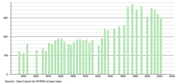 L'évolution du nombre d'habitants est connue à travers les recensements de la population effectués dans la commune depuis 1793. Pour les communes de moins de 10 000 habitants, une enquête de recensement portant sur toute la population est réalisée tous les cinq ans, les populations légales des années intermédiaires étant quant à elles estimées par interpolation ou extrapolation[24]. Pour la commune, le premier recensement exhaustif entrant dans le cadre du nouveau dispositif a été réalisé en 2006[25].