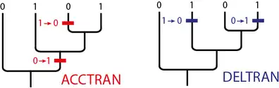 Dans certains cas il n'y a aucun élément pour savoir si l'homoplasie est une réversion ou une convergence, on parle alors d'interprétation ambiguë[31]. Le choix réversion ou convergence est arbitraire[32]. L'hypothèse ACCTRAN (Accelerated transformation) favorise les réversions. L'hypothèse DELTRAN (Delayed transformation) favorise les convergences. L'image ci-dessous l'illustre pour deux arbres ayant la même répartition des caractères.