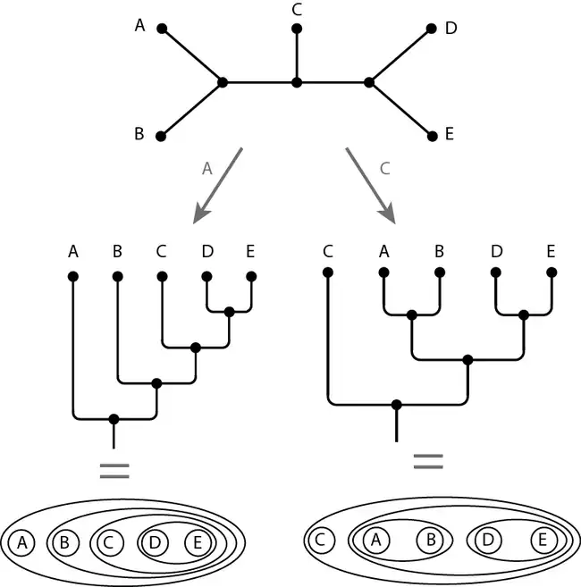 Soient les taxons A, B, C, D, E et F. On considère l'arbre suivant : (A(B((C, D)(E, F)))). Ici R={A+B+C+D+E+F} : c'est la racine ou le nœud qui contient tout. H= {B+C+D+E+F} G= {C+D+E+F} = {I, J} avec I= {C+D} et J= {E+F}. Les nœuds internes H, G, I et J sont des taxons au même titre qu'A, B, C, D, E et F.