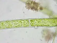 Chaque filament est constitué d'une file unique de cellules cylindriques de grande taille (visibles à la loupe[5]), longues, à nombreux noyaux et à chloroplastes réticulés. Ces chloroplastes contiennent souvent des pyrénoïdes lenticulaires encadrés de chaque côté par un grain d’amidon concaves[3].