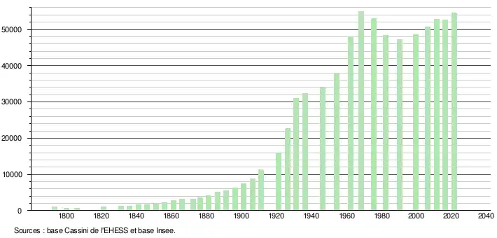 - Par convention dans Wikipédia, le principe a été retenu de n’afficher dans le tableau des recensements et le graphique, pour les populations légales postérieures à 1999, que les populations correspondant à une enquête exhaustive de recensement pour les communes de moins de 10 000 habitants, et que les populations des années 2006, 2011, 2016, etc. pour les communes de plus de 10 000 habitants, ainsi que la dernière population légale publiée par l’Insee pour l'ensemble des communes.