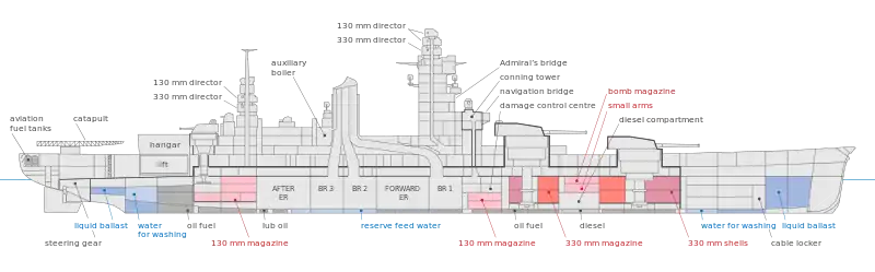 | Armement | 2 tourelles de 4 canons de 330 mm 3 tourelles quadruple et 2 double de canons AA de 130 mm 5 tourelles AA double de 37 mm 4 tourelles AA double de mitrailleuses de 13,2 mm |