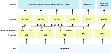 Schéma synthétisant les différentes voies d’orientation offertes en classes préparatoires scientifiques et les liens entre elles.
