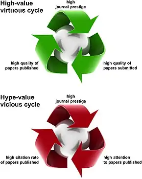 Ensuite, bien que la publication d'un article dans une revue à haut facteur d'impact ne garantisse pas les citations, elle constitue un critère d'évaluation de la productivité et impose aux chercheurs une importante pression de publication[96]. Le risque est ici que les chercheurs se préoccupent plus d'augmenter leur nombre de publications selon le principe « publier ou périr » que de réaliser des travaux scientifiquement intéressants. En effet, pour les chercheurs, le nombre de publications est maintenant un déterminant majeur de leur carrière, des possibilités de promotions, de leur salaire, voire la continuité de leur emploi[97].