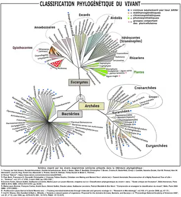 ─o le vivant │ ├─o Eubactéries │ ├─o Protéobactéries │ │ ├─o Protéobactéries ε │ │ └─o │ │ ├─o Protéobactéries δ │ │ └─o │ │ ├─o Protéobactéries α │ │ └─o │ │ ├─o Protéobactéries β │ │ └─o Protéobactéries γ │ ├─o │ │ ├─o Firmicutes │ │ │ ├─o Groupe Bacillus / Clostridium │ │ │ └─o Actinobactéries │ │ └─o │ │ ├─o Cyanobactéries │ │ └─o Groupe Thermus / Deinococcus │ ├─o │ │ ├─o Bactéries vertes sulfureuses │ │ └─o │ │ ├─o Flavobactéries (Cytophagales) │ │ └─o Bactéroïdes │ ├─o │ │ ├─o Spirochètes │ │ └─o Chlamydiales │ ├─o Planctomycétales │ ├─o Bactéries vertes non sulfureuses │ ├─o Aquificales │ └─o Thermotogales │ ├─o Archées │ ├─o Crénarchées │ │ ├─o Thermoprotéales │ │ └─o │ │ ├─o Desulfurococcales │ │ └─o Sulfolobales │ └─o Euryarchées │ ├─o Thermococcales │ └─o │ ├─o Méthanopyrales │ └─o │ ├─o Methanobacteriales │ └─o │ ├─o Méthanococcales │ └─o │ ├─o Thermoplasmales │ ├─o Archaeoglobales │ ├─o Halobactériales │ └─o │ ├─o Méthanomicrobiales │ └─o Méthanosarcinales │ └─o Eucaryotes │ ├─o Bicontes │ │ │ ├─o Lignée verte │ │ ├─o Glaucophytes │ │ └─o Métabiontes │ │ ├─o Rhodobiontes │ │ └─o Chlorobiontes │ │ ├─o Ulvophytes │ │ ├─o Prasinophytes │ │ └─o Streptophytes │ │ ├─? Chlorokybophytes │ │ ├─o Klebsormidiophytes │ │ └─o Phragmoplastophytes │ │ ├─o Zygnématophytes │ │ └─o Plasmodesmophytes │ │ ├─? Chaetosphaeridiophytes │ │ ├─o Charophytes │ │ └─o Parenchymophytes │ │ ├─o Coléochaetophytes │ │ └─o Embryophytes │ │ ├─o Marchantiophytes │ │ └─o Stomatophytes │ │ ├─o Anthocérophytes │ │ └─o Hémitrachéophytes │ │ ├─o Bryophytes │ │ └─o Polysporangiophytes │ │ ├─o Lycophytes │ │ └─o Euphyllophytes │ │ ├─o Moniliformopses │ │ │ ├─o Sphénophytes │ │ │ └─o Filicophytes │ │ └─o Spermatophytes │ │ ├─o Ginkgophytes │ │ ├─o Pinophytes │ │ ├─o Cycadophytes │ │ ├─o Gnétophytes │ │ └─o Angiospermes │ │ ├─o Amborellales │ │ └─o │ │ ├─o Nymphaeales │ │ └─o │ │ ├─o Austrobaileyales │ │ └─o Euangiospermes │ │ ├─o Chloranthales │ │ ├─o Cératophyllales │ │ ├─o Magnoliidées │ │ │ ├─o │ │ │ │ ├─o Magnoliales │ │ │ │ └─o Laurales │ │ │ └─o │ │ │ ├─o Canellales │ │ │ └─o Piperales │ │ ├─o Monocotylédones │ │ │ ├─o Acorales │ │ │ └─o │ │ │ ├─o Alismatales │ │ │ └─o Eumonocotylédones │ │ │ ├─o Miyoshiales │ │ │ ├─o Dioscoreales │ │ │ ├─o Pandanales │ │ │ ├─o Liliales │ │ │ ├─o Asparagales │ │ │ └─o Commélinidées │ │ │ ├─o Dasypogonales │ │ │ ├─o Arecales │ │ │ └─o │ │ │ ├─o Poales │ │ │ └─o │ │ │ ├─o Commelinales │ │ │ └─o Zingiberales │ │ └─o Eudicotylédones │ │ ├─o Ranunculales │ │ └─o │ │ ├─o Sabiales │ │ ├─o Proteales │ │ ├─o Buxales │ │ ├─o Trochodendrales │ │ └─o Fonds des tricolpées │ │ ├─o Berberidopsidales │ │ ├─o Santalales │ │ ├─o │ │ │ ├─o Dilleniales │ │ │ └─o Caryophyllales │ │ ├─o │ │ │ ├─o Saxifragales │ │ │ ├─o Vitales │ │ │ └─o Rosidées │ │ │ ├─o Crossosomatales │ │ │ ├─o Geraniales │ │ │ ├─o Myrtales │ │ │ ├─o Eurosidées I │ │ │ │ ├─o Zygophyllales │ │ │ │ ├─o │ │ │ │ │ ├─o Celastrales │ │ │ │ │ ├─o Malpighiales │ │ │ │ │ └─o Oxalidales │ │ │ │ └─o │ │ │ │ ├─o Fabales │ │ │ │ ├─o Rosales │ │ │ │ ├─o Cucurbitales │ │ │ │ └─o Fagales │ │ │ └─o Eurosidées II │ │ │ ├─o Brassicales │ │ │ ├─o Huerteales │ │ │ ├─o Malvales │ │ │ └─o Sapindales │ │ └─o Astéridées │ │ ├─o Cornales │ │ ├─o Ericales │ │ └─o Euastéridées │ │ ├─o Euastéridées I │ │ │ ├─o Garryales │ │ │ └─o │ │ │ ├─o Gentianales │ │ │ └─o │ │ │ ├─o Lamiales │ │ │ └─o Solanales │ │ └─o Euastéridées II │ │ ├─o Aquifoliales │ │ └─o │ │ ├─o Apiales │ │ ├─o Asterales │ │ └─o Dipsacales │ │ │ ├─o Chromoalvéolés │ │ ├─o Alvéolobiontes │ │ │ ├─o Ciliés │ │ │ ├─o Dinophytes │ │ │ └─o Apicomplexés │ │ ├─o Straménopiles │ │ ├─o Cryptophytes │ │ └─o Haptophytes │ │ │ ├─o Rhizariens │ │ ├─o Actinopodes │ │ ├─o Foraminifères │ │ └─o Chlorarachniophytes │ │ │ └─o Excavobiontes │ ├─o Euglénobiontes │ ├─o Parabasaliens │ ├─o Métamonadines │ └─o Percolozoaires │ └─o Unicontes │ ├─o Amoebozoaires │ ├─o Rhizopodes │ └─o Mycétozoaires │ └─o Opisthocontes ├─o Champignons │ ├─o Microsporidies │ └─o Eumycètes │ ├─o Chytridiomycètes │ └─o │ ├─o Zygomycètes │ └─o │ ├─o Ascomycètes │ └─o Basidiomycètes └─o Choano-organismes ├─o Choanoflagellés └─o Métazoaires ├─? Placozoaires ├─o Démosponges ├