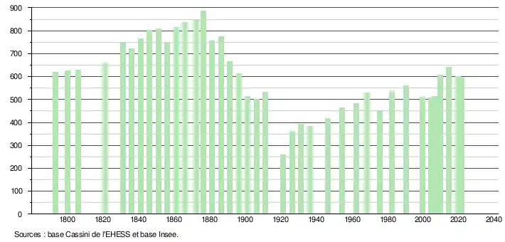 L'évolution du nombre d'habitants est connue à travers les recensements de la population effectués dans la commune depuis 1793. Pour les communes de moins de 10 000 habitants, une enquête de recensement portant sur toute la population est réalisée tous les cinq ans, les populations légales des années intermédiaires étant quant à elles estimées par interpolation ou extrapolation[24]. Pour la commune, le premier recensement exhaustif entrant dans le cadre du nouveau dispositif a été réalisé en 2004[25].